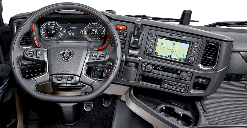 Передняя часть откидной кабины выглядит выразительно и уникально. Здесь нашлось место для огромной радиаторной решетки, красивой светотехники, большого по площади ветрового стекла и прочного бампера. Улучшить экстерьер автомобиля и сделать его еще более неординарным вам поможет тюнинг на Сканию, аксессуары которого имеются в нашем каталоге.